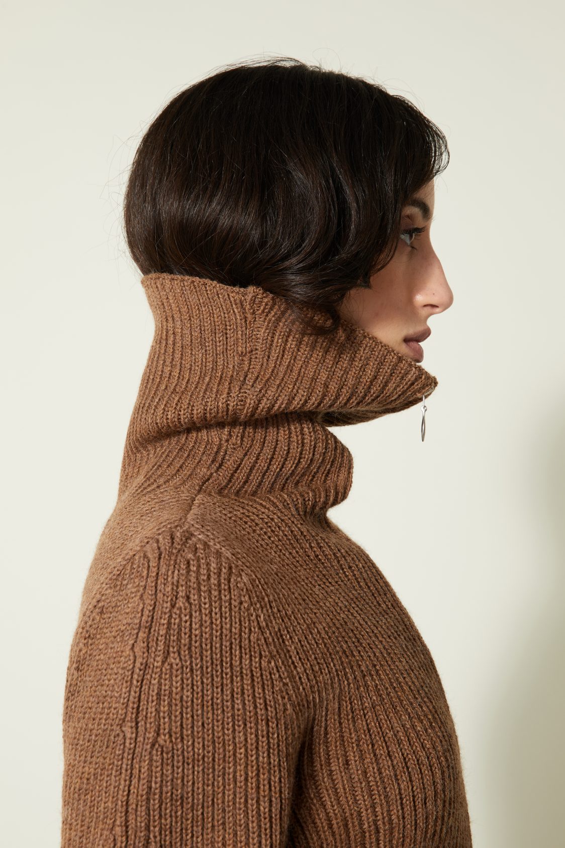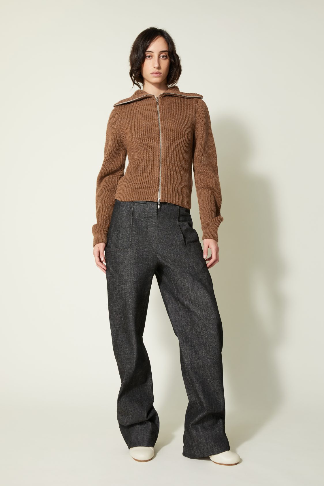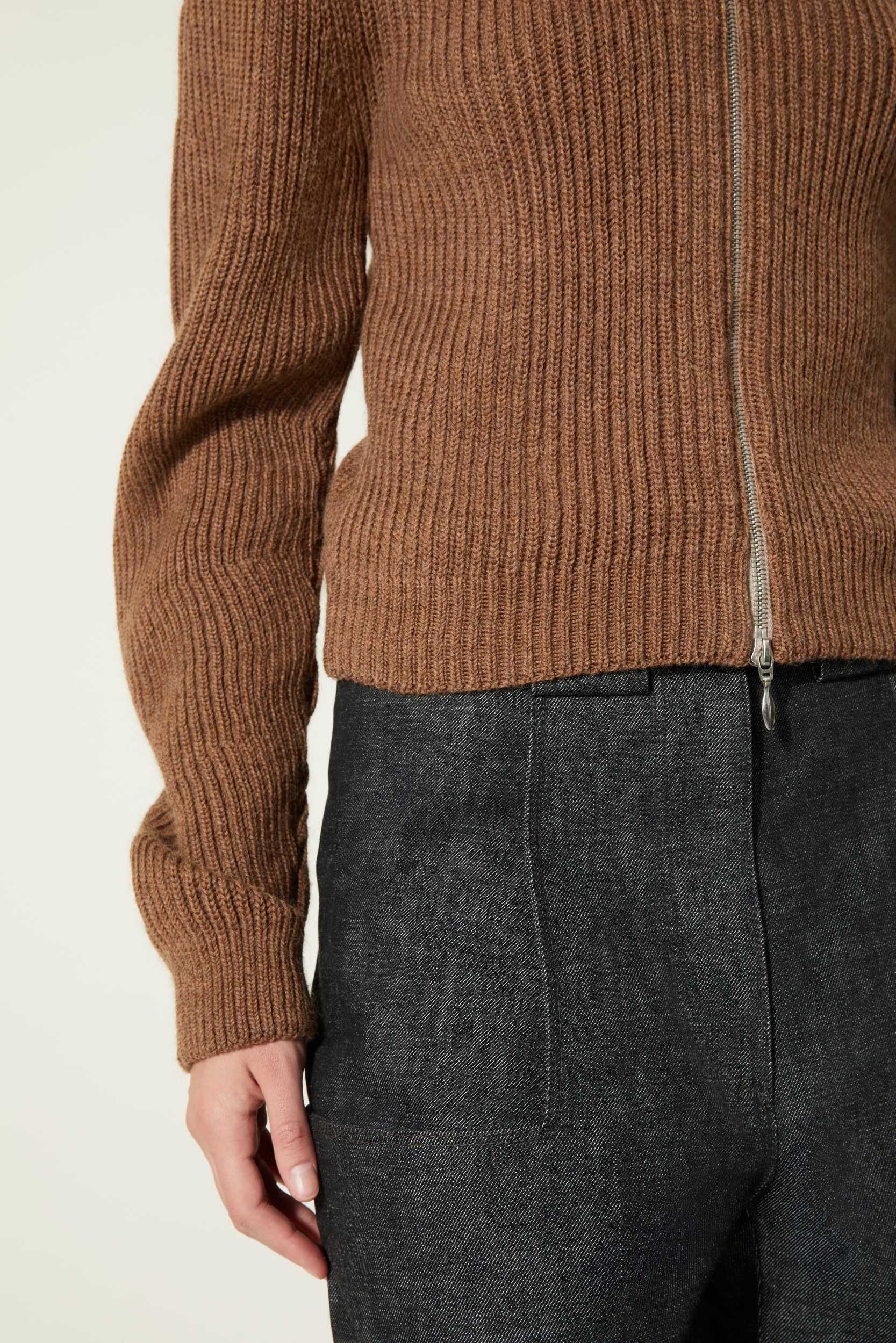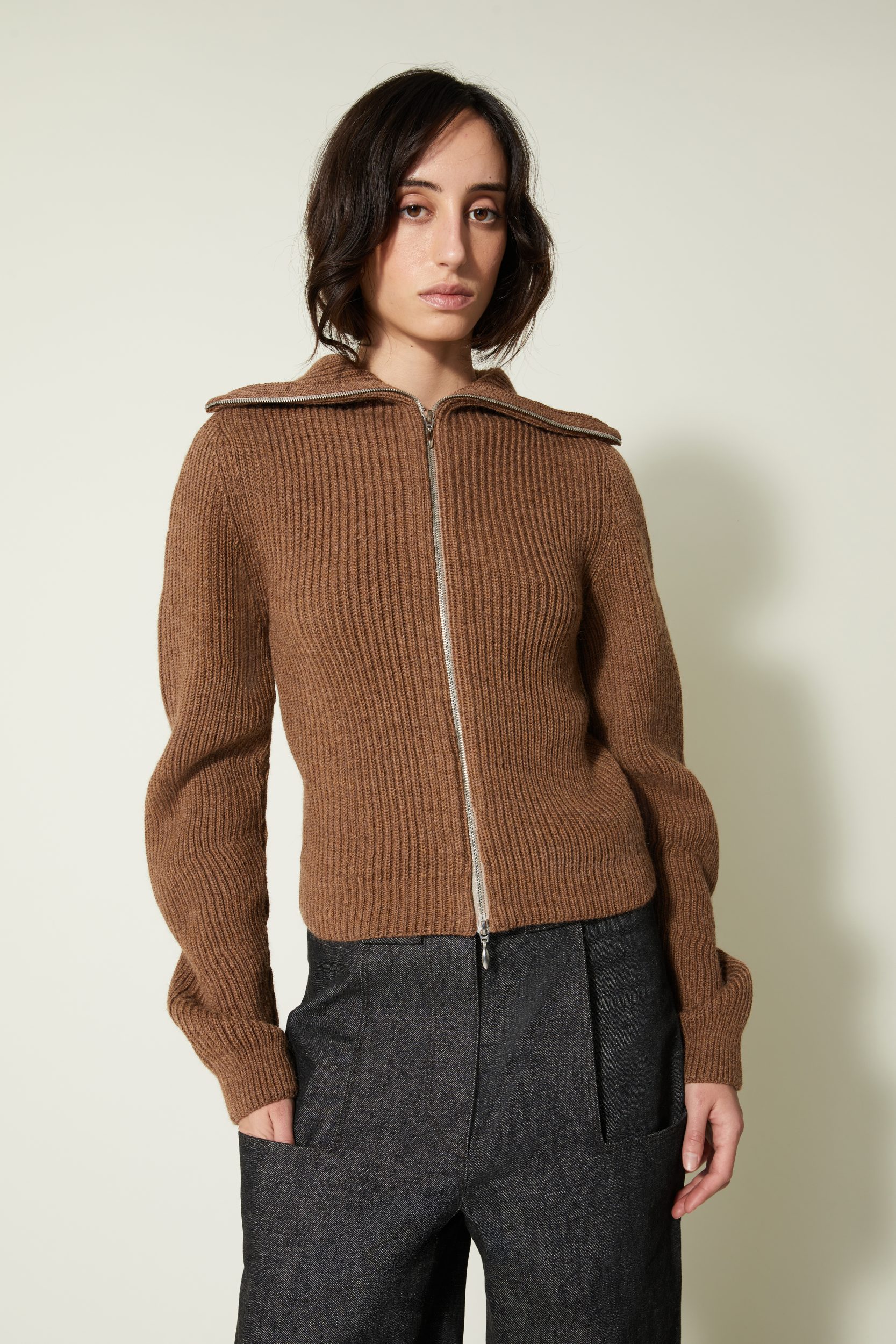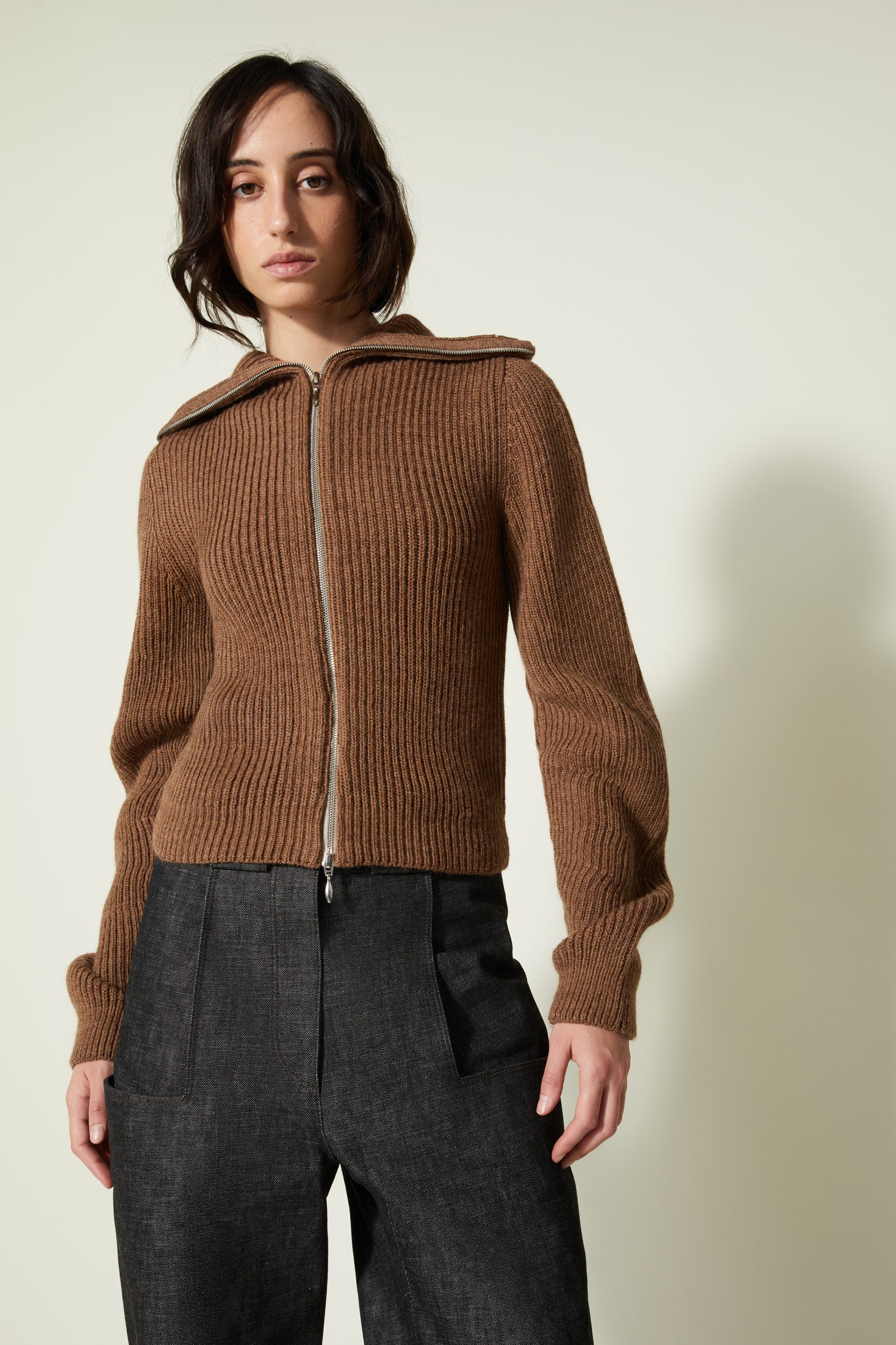 Une nouvelle veste cardigan élaboré en côtes anglaises avec un fil de pure laine vierge sélectionnée pour sa main. Il a une particularité notable : la manche est tricotée plus longue du côté extérieur du bras qu’à l’intérieur ce qui crée ce mouvement ondulé.