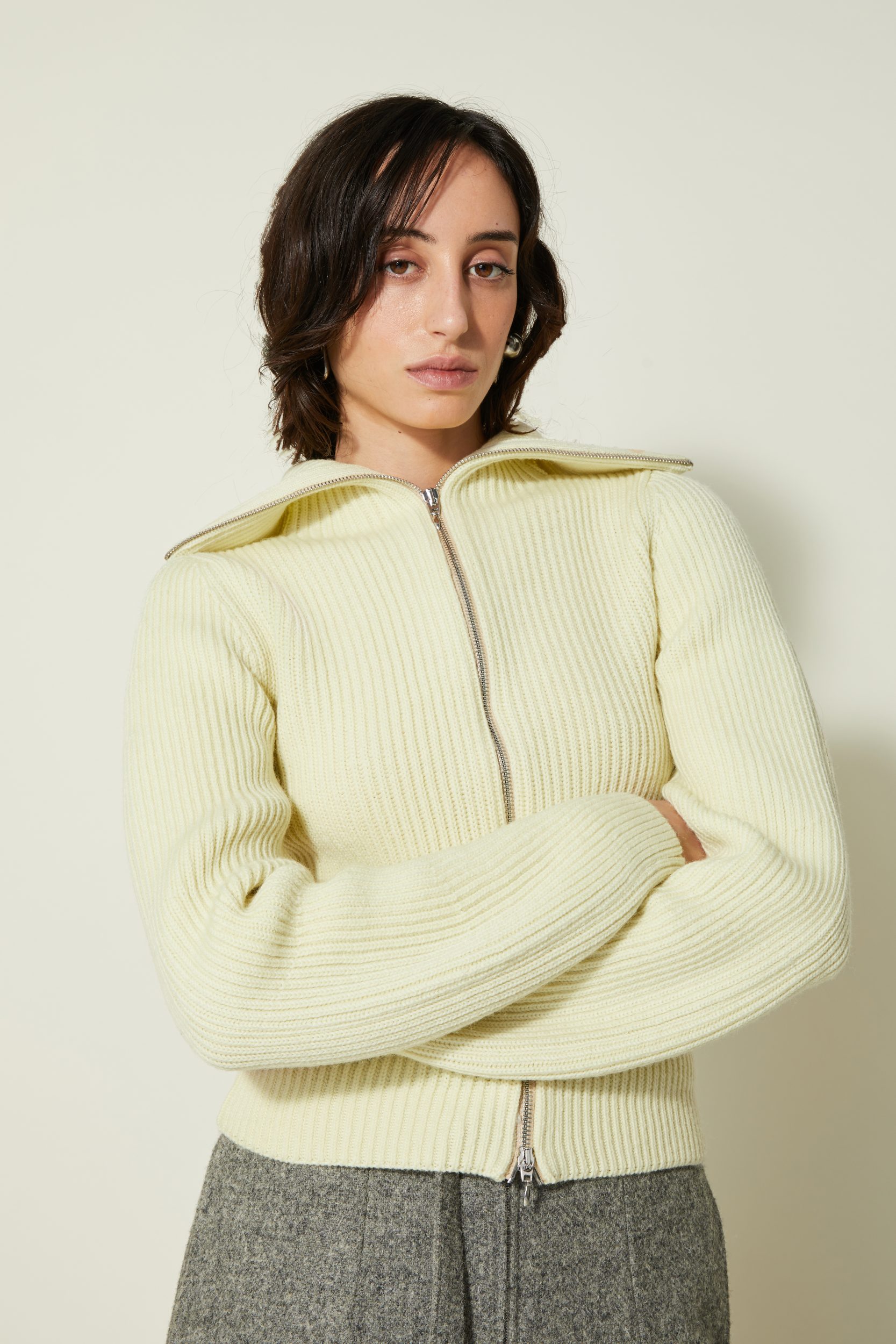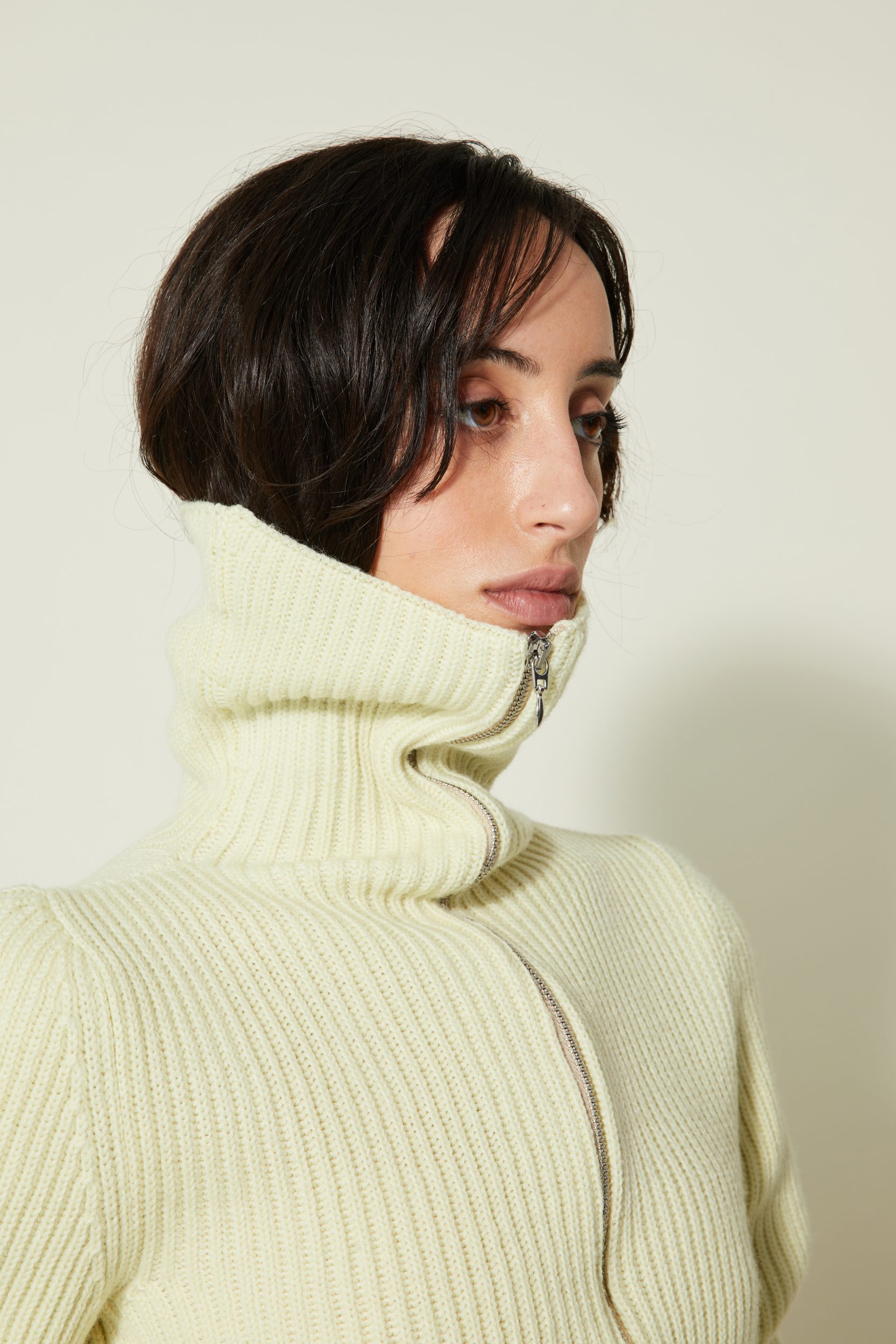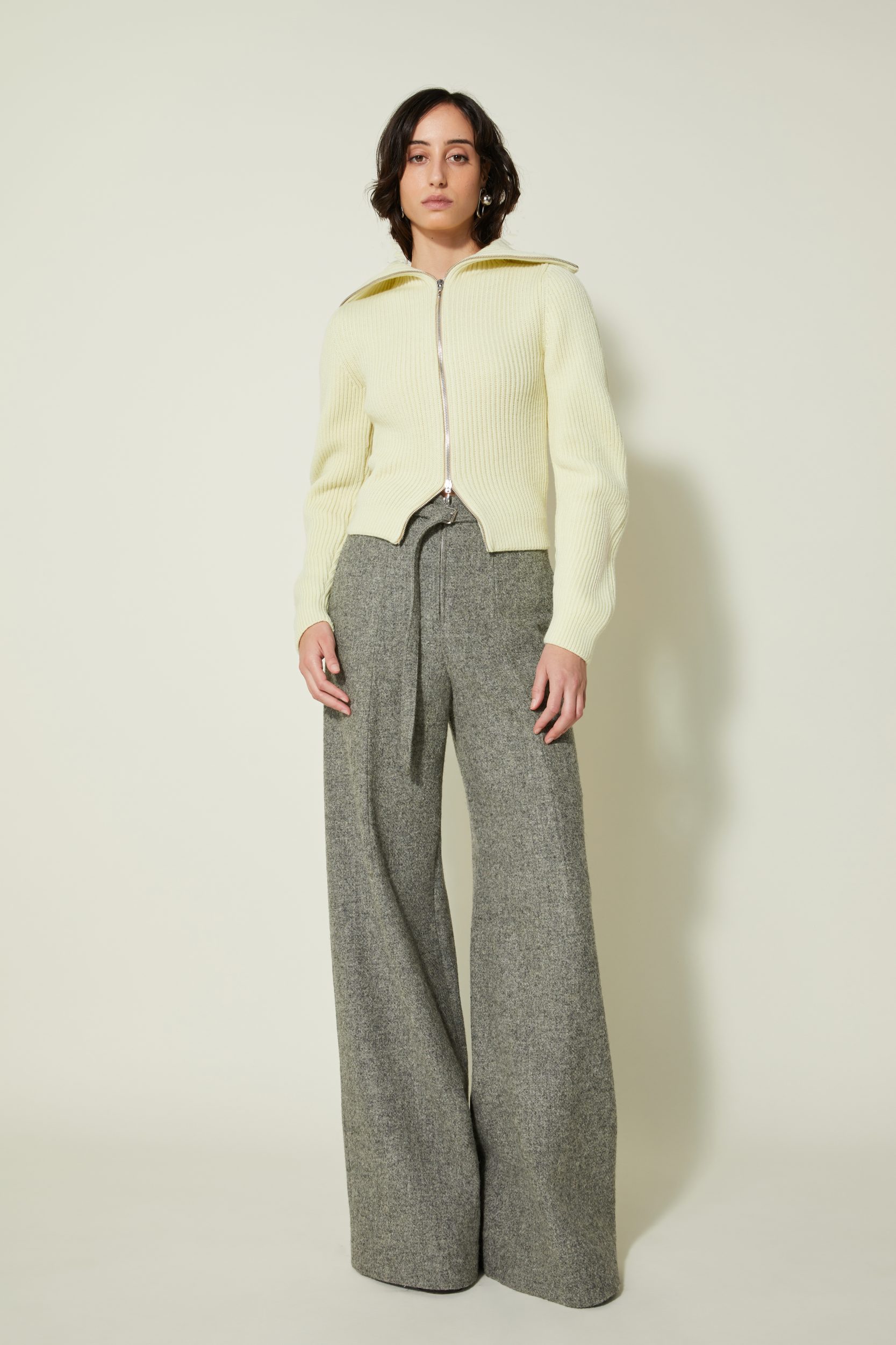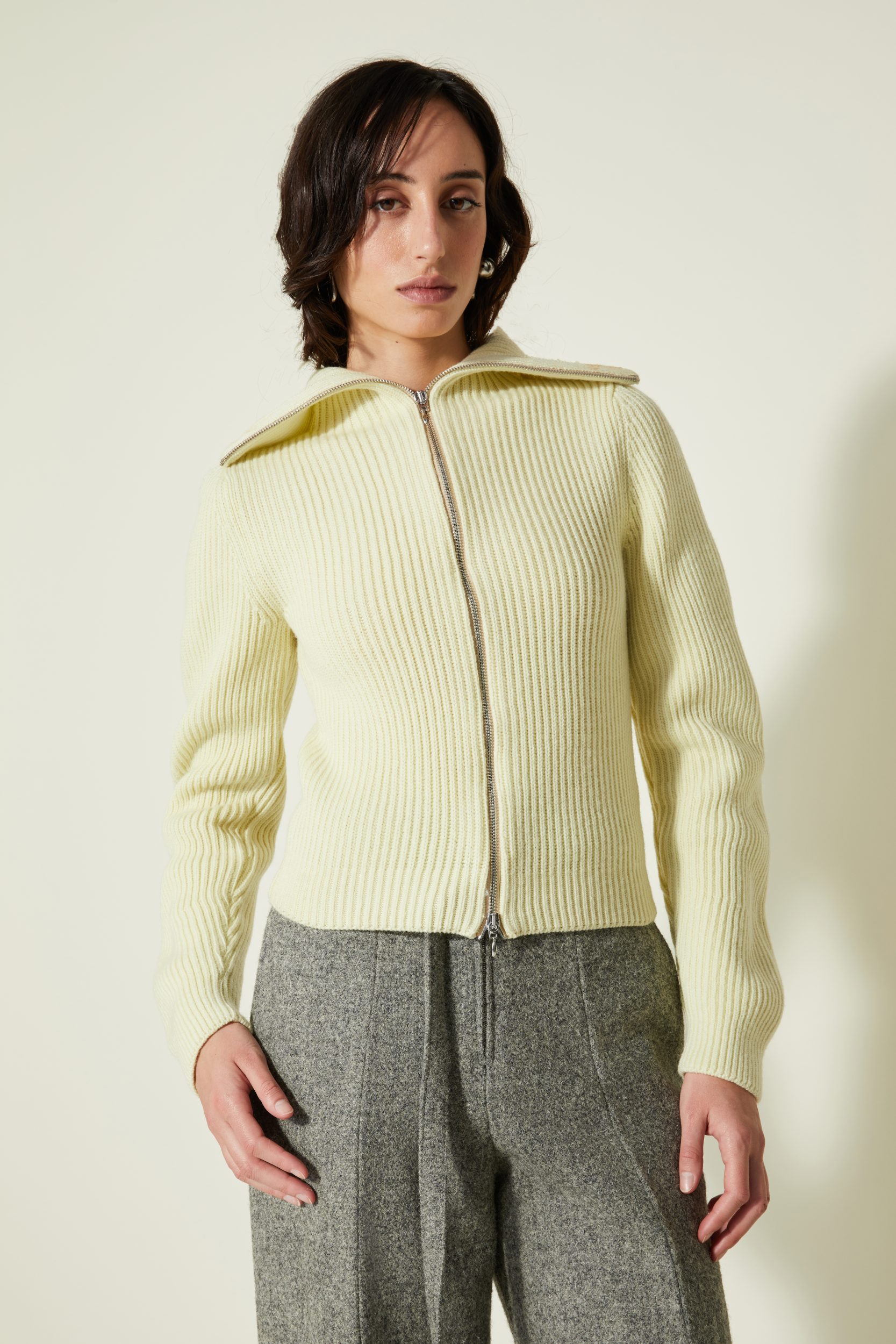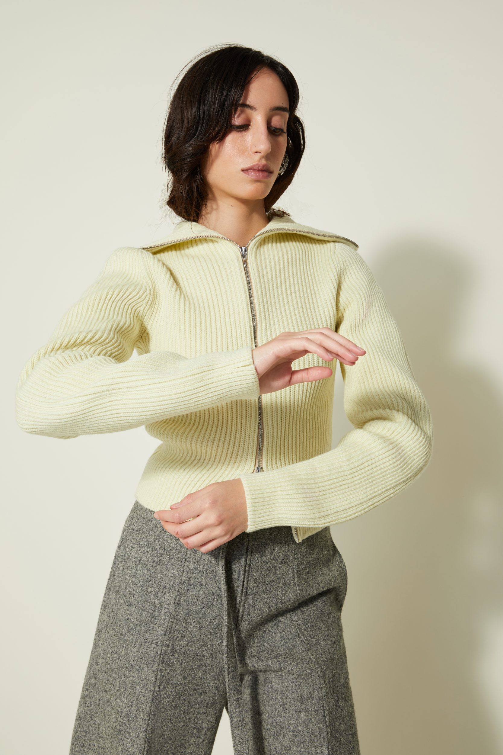 Une nouvelle veste cardigan élaboré en côtes anglaises avec un fil de pure laine vierge sélectionnée pour sa main. Il a une particularité notable : la manche est tricotée plus longue du côté extérieur du bras qu’à l’intérieur ce qui crée ce mouvement ondulé.