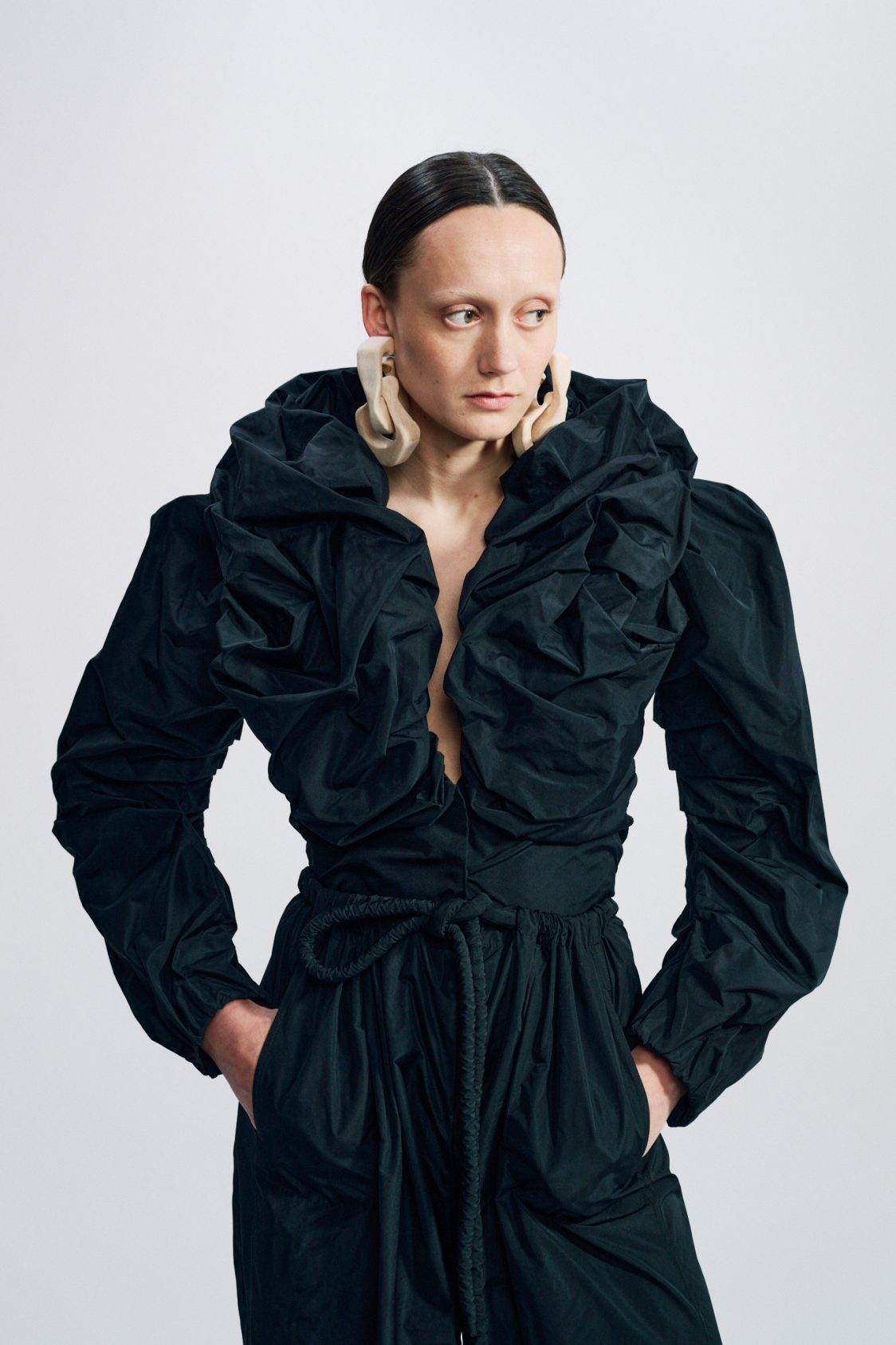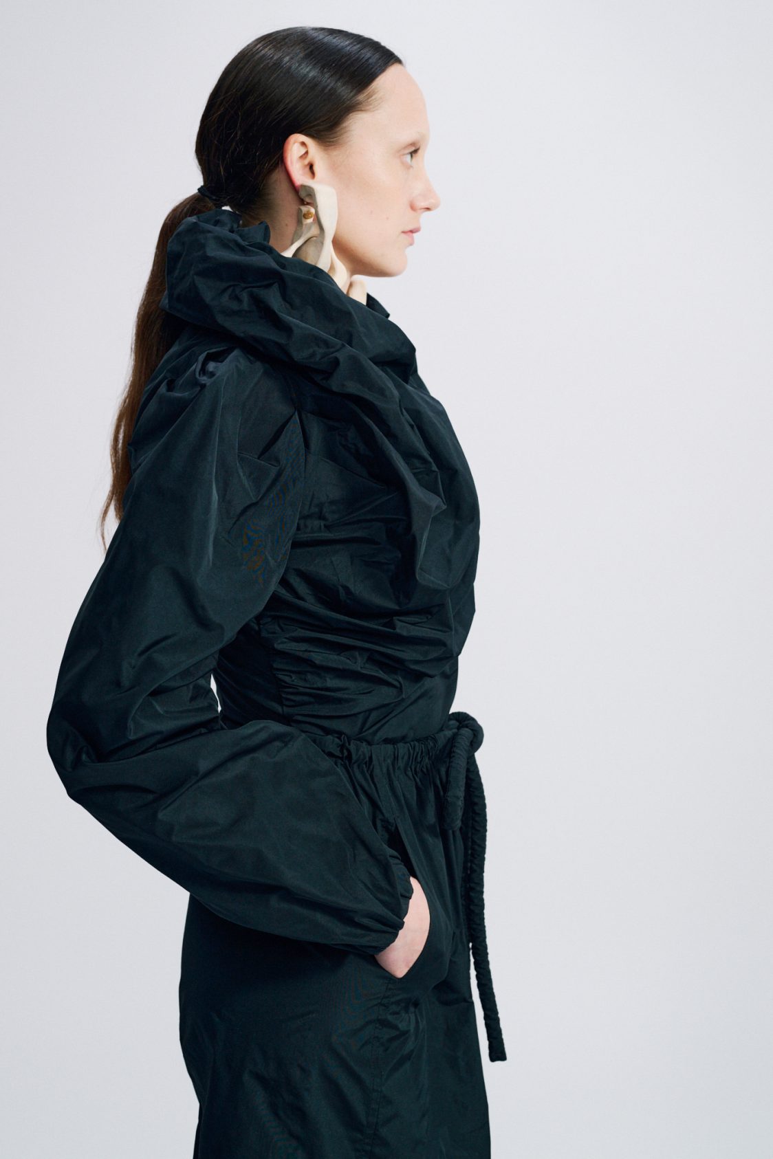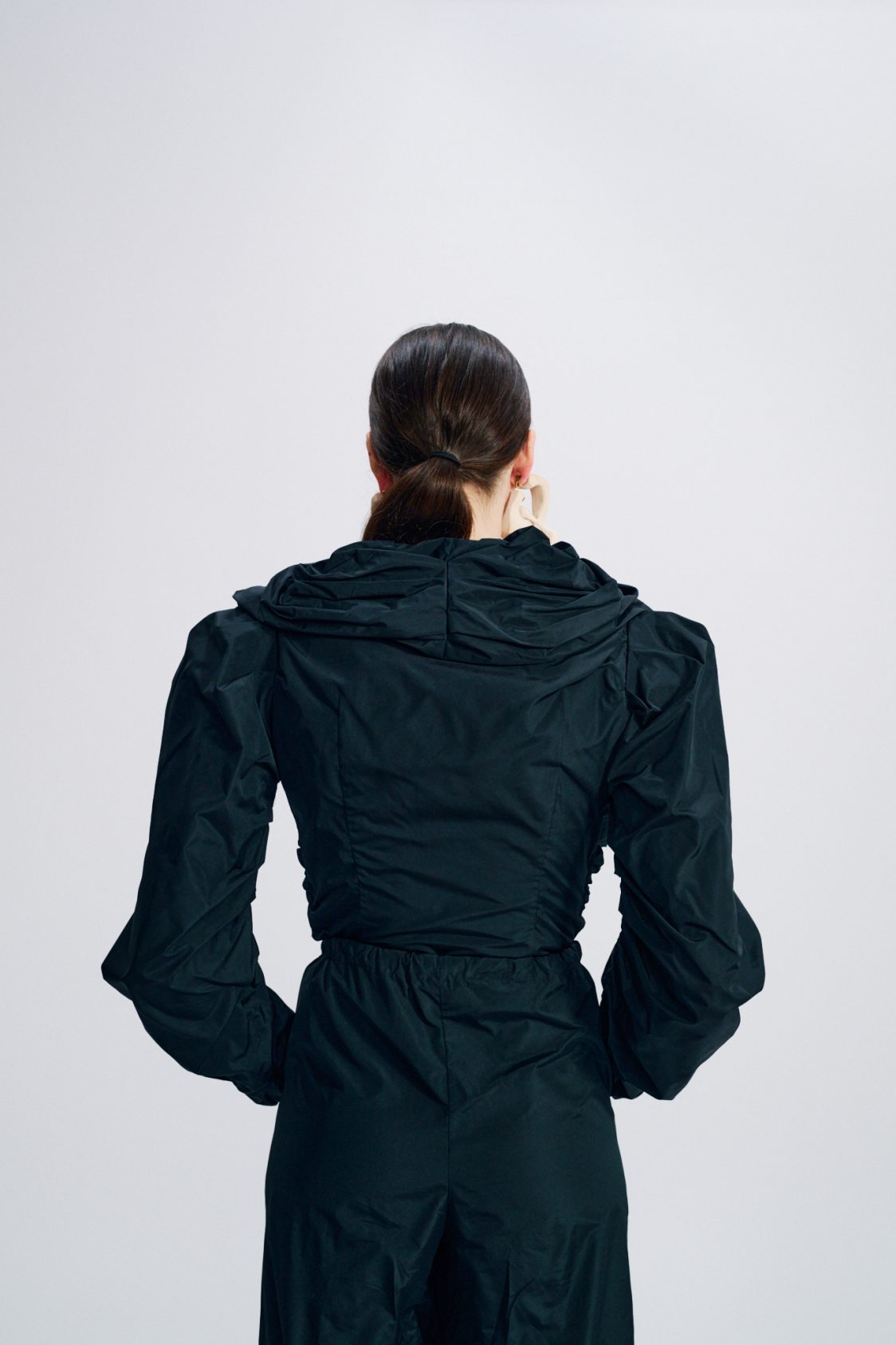 Veste technique Véronique Leroy en taffeta froissé. Sa caractéristique principale est un col « shapeable » volumineux et malléable, permettant de régler son ampleur et de moduler le décolleté. La pièce est complétée par des manches bouffantes froncées.