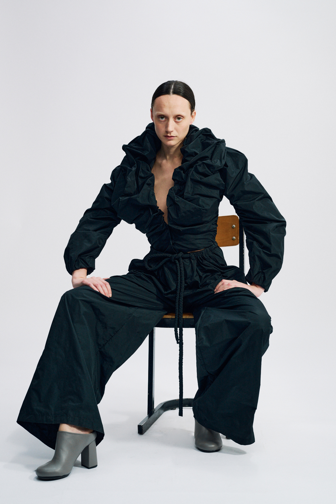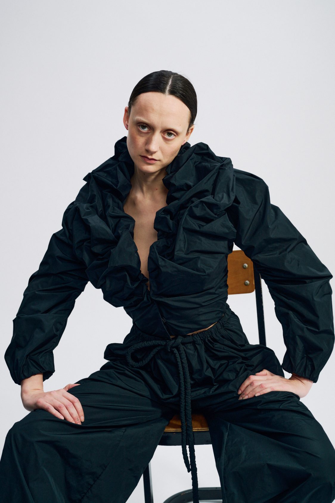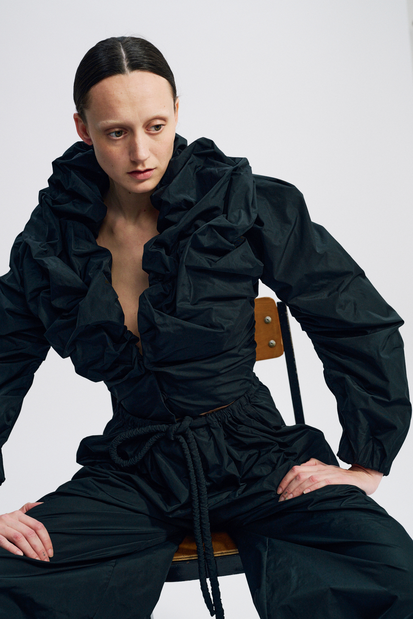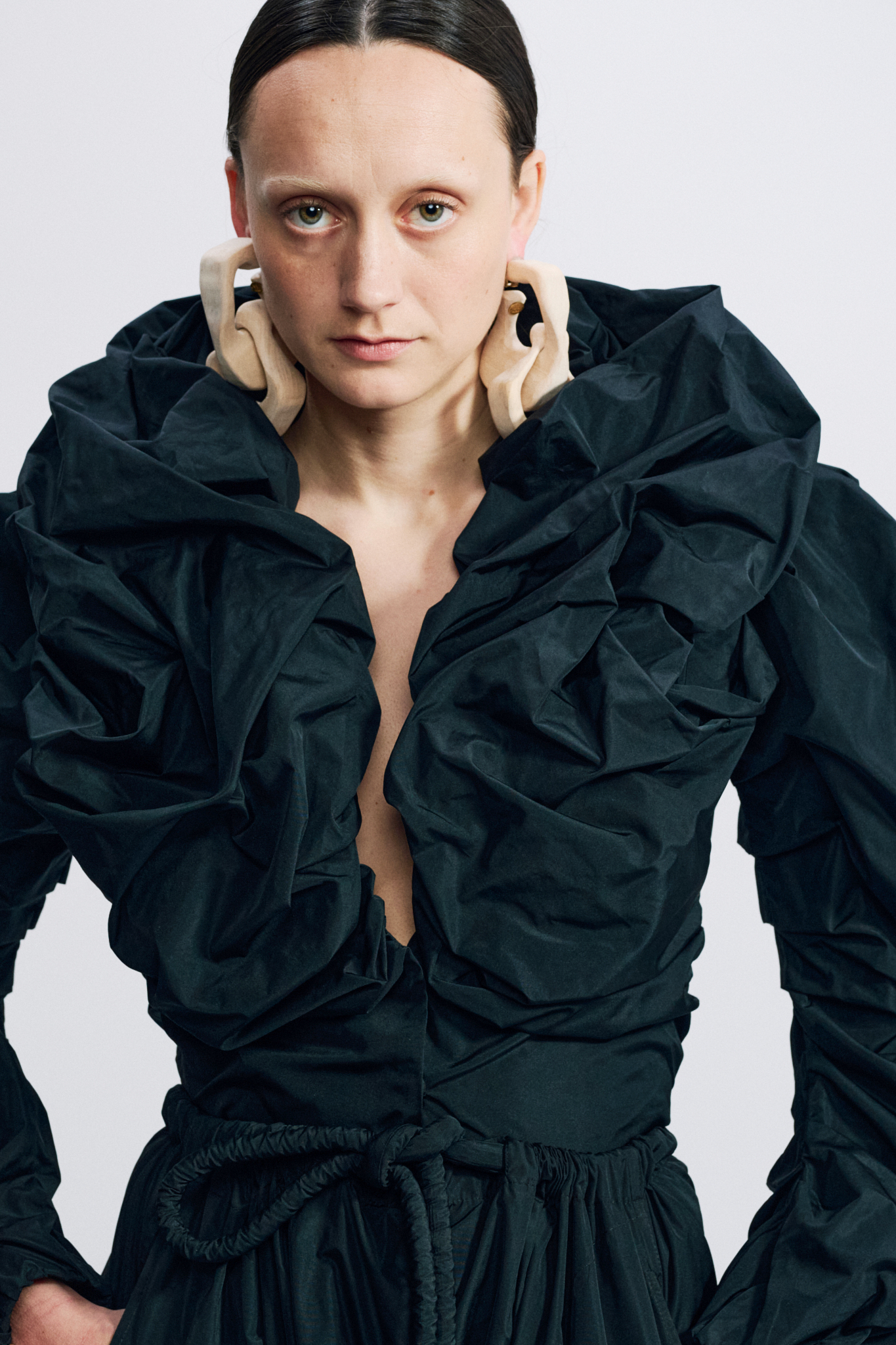Veste technique Véronique Leroy en taffeta froissé. Sa caractéristique principale est un col « shapeable » volumineux et malléable, permettant de régler son ampleur et de moduler le décolleté. La pièce est complétée par des manches bouffantes froncées.